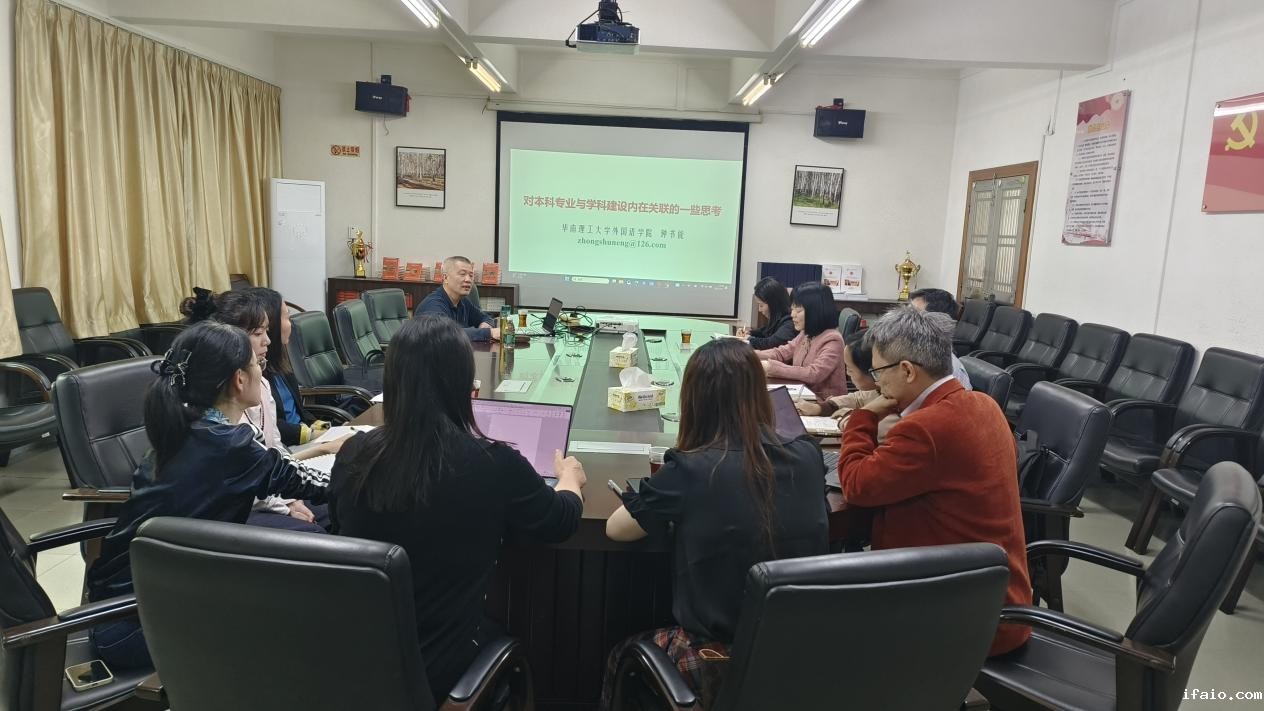 4月7日,华南理工大学外国语学院钟书能教授应邀来我院座谈,围绕“对本科专业与学科建设内在关联的一些思考”这一主题进行学术交流。本次座谈会由涂兵兰院长主持,洪溪珧、陈树坤、甘容辉副院长,各系主任及科研骨干教师共同参与。