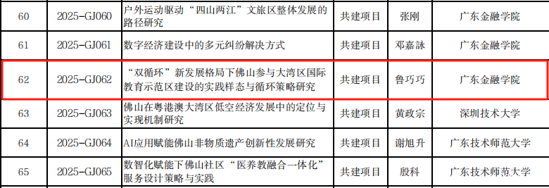 在2025年度佛山市社科规划课题项目的评审工作中,18luck官方的鲁巧巧副教授成功获批立项。鲁老师主持的项目名为“双循环新发展格局下佛山参与大湾区国际教育示范区建设的实践样态与循环策略研究”(项目编号:2025-GJ062)。