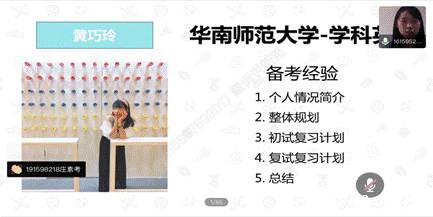 最后进行分享的是考取了广东外语外贸大学英语笔译专业的李惠萍同学,李同学将她详尽的备考内容、阅读书目和作息安排等内容无私分享给大家,并建议大家根据考研学校的出题方向,来制定复习计划。
