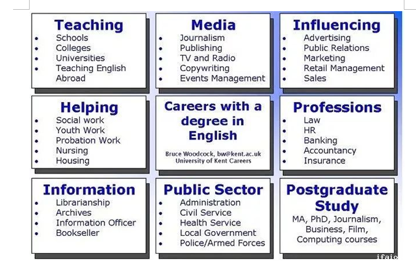 Unlike a student of accounting or something else, an undergraduate English major has not been trained for one specific kind of work. Therefore, some of us may wonder what on earth we can do with a BA in English. In fact, we have a lot of choices. We are really promising in the future. English majors develop a wide range of transferable skills while engaged in studying, such as writing, communicating, problem solving, critical thinking, and logical analysis, etc, which are highly prized by employers in nearly every profession. Whether you're aware of it or not, they are important workplace skills that employers of all sorts will place at a premium -- whether those employers are located in the field of education, communications, government, business, health and human services. As an English major, you're a lot more valuable and flexible than you think.