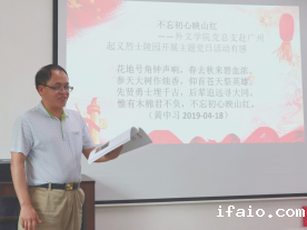 颁奖仪式伊始,黄晓莉做开场发言,表示今年恰逢建党一百周年,中国共产党取得的伟大成就,是革命先辈们用热血和生命谱写的爱国华章,在这神圣隆重的日子里,外院师生不忘初心颂党恩,扬帆逐梦迎百年。她对49位外文学子积极参与建党百年征文给予充分肯定,同学们的作品有中文赞颂,有英文散文,内容充实、文字生动、感情真挚,展现了我院学子深厚的爱国爱党精神和家国情怀。并激励大家深入学党史,知党恩,永远跟党走,砥砺前行,取得新进步,再创新业绩。