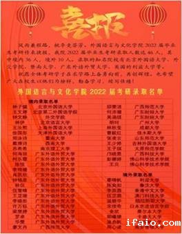 日前,2022年全国硕士研究生招生录取工作落下帷幕。在新利luck全站登录全体师生的共同努力下,2022届考研学子传来捷报。学院考研录取人数达45人,其中境内36人,境外9人,占全院总人数的16.91%,其中英语1、2班的考研录取率分别达到24.24%和25.81%,升学率达到历史新高,考研率和考研录取率双双名列全校第一。录取的知名院校有北京外国语大学、外交学院、暨南大学、广东外语外贸大学、英国的利兹大学等。
