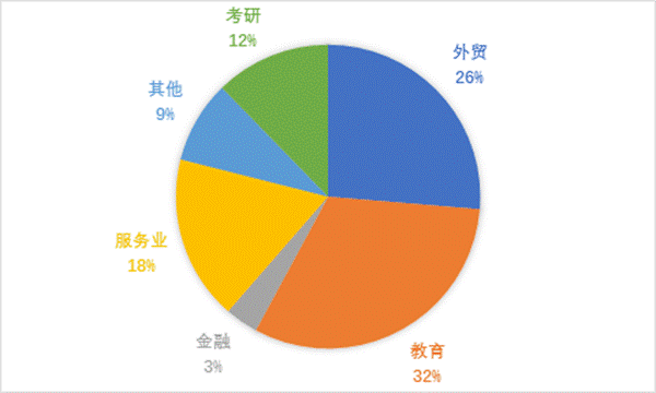 翻译专业毕业生专业知识基础扎实,实践问题解决能力强,具有勤勉务实的优秀品质,深受用人单位欢迎与好评,近年来的考研率和就业率均位于全校前列,过去五年就业率达95%以上,就业行业主要包括金融、保险、外贸、教育培训、语言服务、跨境电商等,例如,2021届翻译专业就业人数57人,其中外贸行业15人,教育培训行业18人,金融业2人,服务业10人,考研升学7人,其它行业5人。就业区域主要集中在粤港澳大湾区,用人单位对毕业生满意度高。