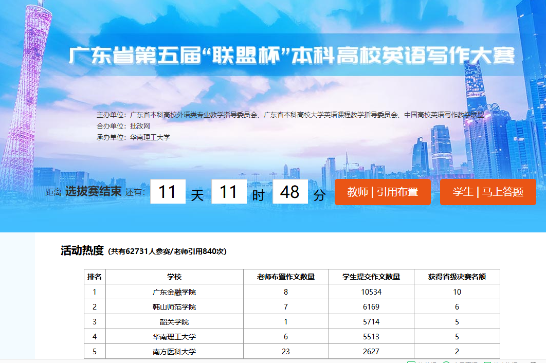 在本次写作活动中,广东省高校共有62731人参赛,其中我校学生提交的作文数量为10534篇,在广东省各高校的参与活动热度最高,并获得10个决赛参赛名额,份额最多。希望我校参赛选手再接再厉,在指导老师的指导下,争取发挥自己的最好水平。
