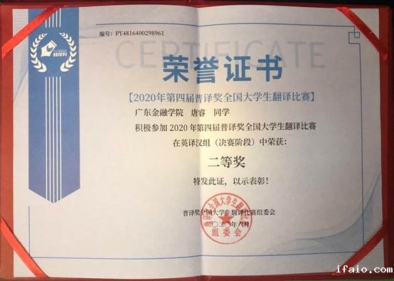 为贯彻《教育部关于全面提高高等教育质量的若干意见》,配合《中国英语能力等级量表》的实施和推广,以语言应用为导向,为大学生提供展示英语应用能力平台,激发大学生学习英语的积极性,第四届“普译奖”全国大学生翻译比赛于2020年5月份举行,我院19级翻译专业唐睿同学(191598212)荣获英译汉组二等奖。