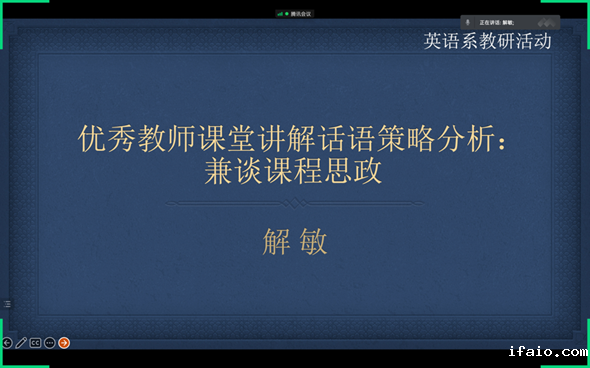 12月16日周五下午5:00,英语系通过腾讯会议举办了本学期教研活动。本次活动致力于推动学院下达的课程思政任务,为教学文件更新、切实落实课程思政,提供思路和方法。活动围绕解敏博士所作的报告展开,报告题为:优秀教师课堂讲解话语策略分析——兼谈课程思政。