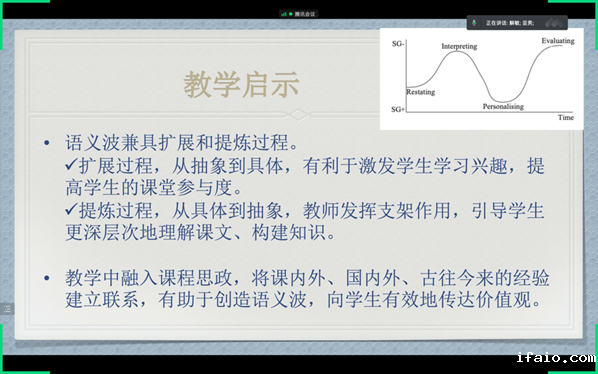 该报告内容为解老师近年来发表在国内外语言学核心杂志的研究成果。解老师以通俗易懂的方式,基于语义波理论,聚焦以文本为基础的英语教学,首先呈现了优秀教师课堂讲解所使用的话语策略。接下来,她将话语策略与课程思政相联系,力求探讨课程思政在话语层面的实现方式。她指出,在教学中融入课程思政,将课内外、国内外、古往今来的经验建立联系,有助于创造语义波,向学生有效地传达价值观。