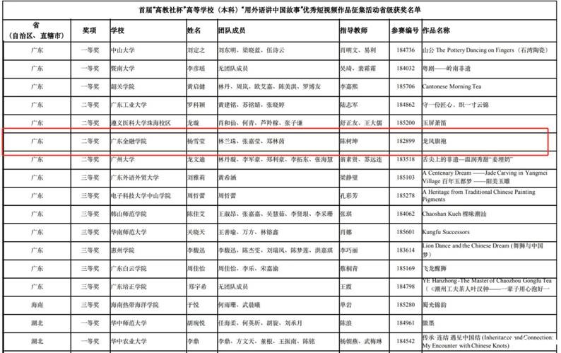 近日,由南京大学联合高等教育出版社举办的首届“高教社杯用外语讲中国故事”高等学校(本科)优秀短视频作品征集活动结果揭晓,我院陈树坤老师指导的学生团队杨雪莹、张嘉莹、郑林茵、林兰珠共同创作的《龙凤旗袍》荣获广东省二等奖。