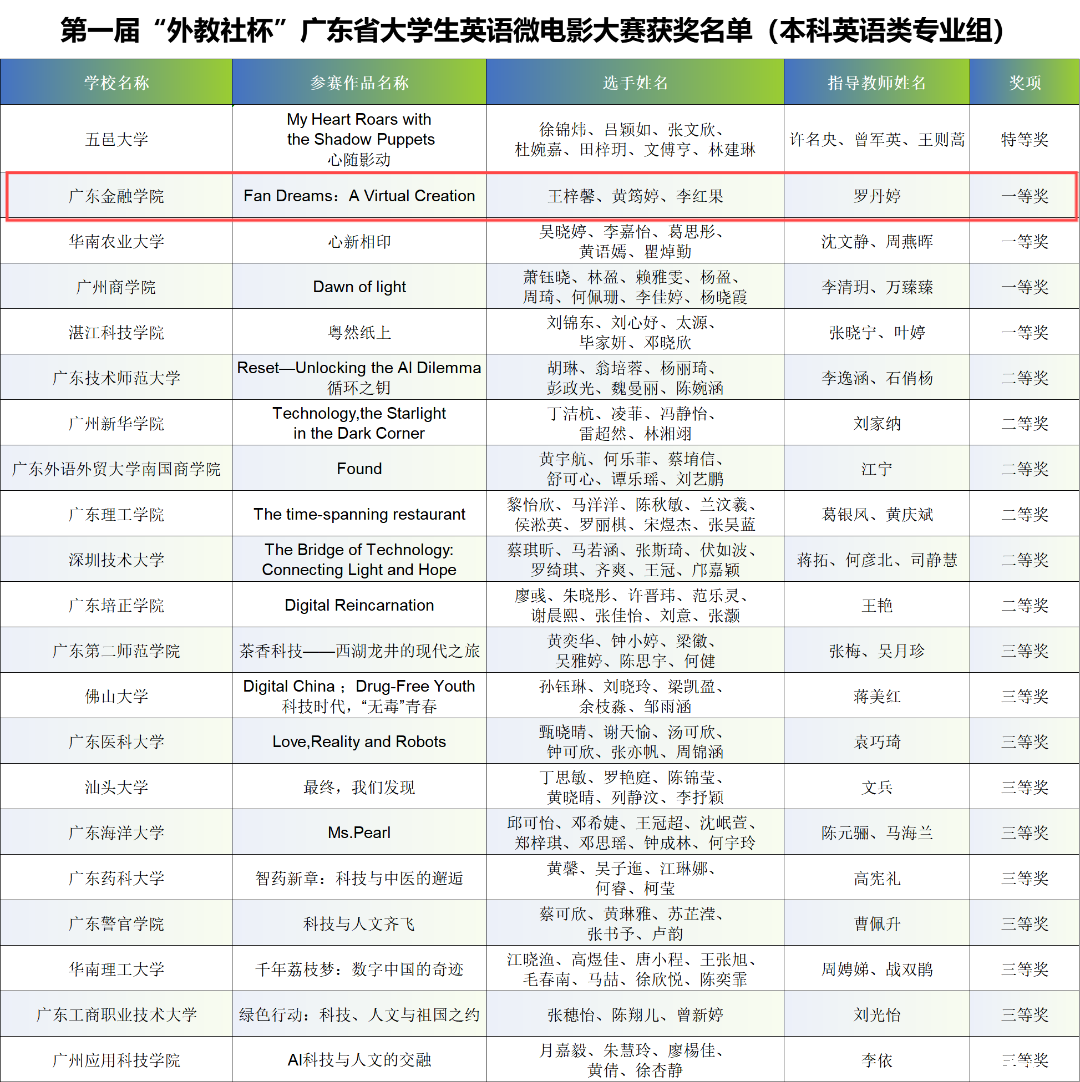 本届大赛得到广大院校师生的积极响应和参与,报名参赛队伍逾五十支,充分展现出当代大学生对英语微电影创作的极高热情和无限创意。本次大赛获得外文学院领导的大力支持,我院王梓馨、黄筠婷和李红果同学在罗丹婷老师的指导下荣获第一届“外教社杯”广东省大学生英语微电影大赛(本科英语类专业组)一等奖及最佳英语表达奖。