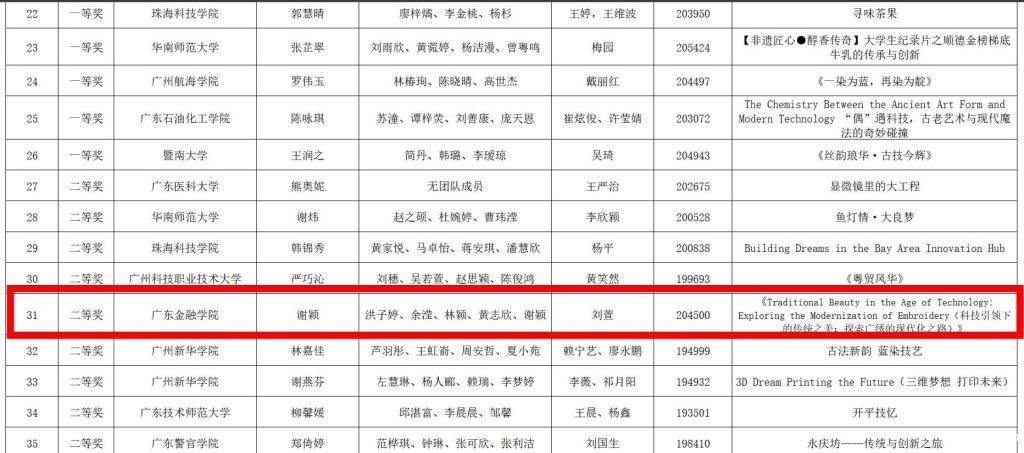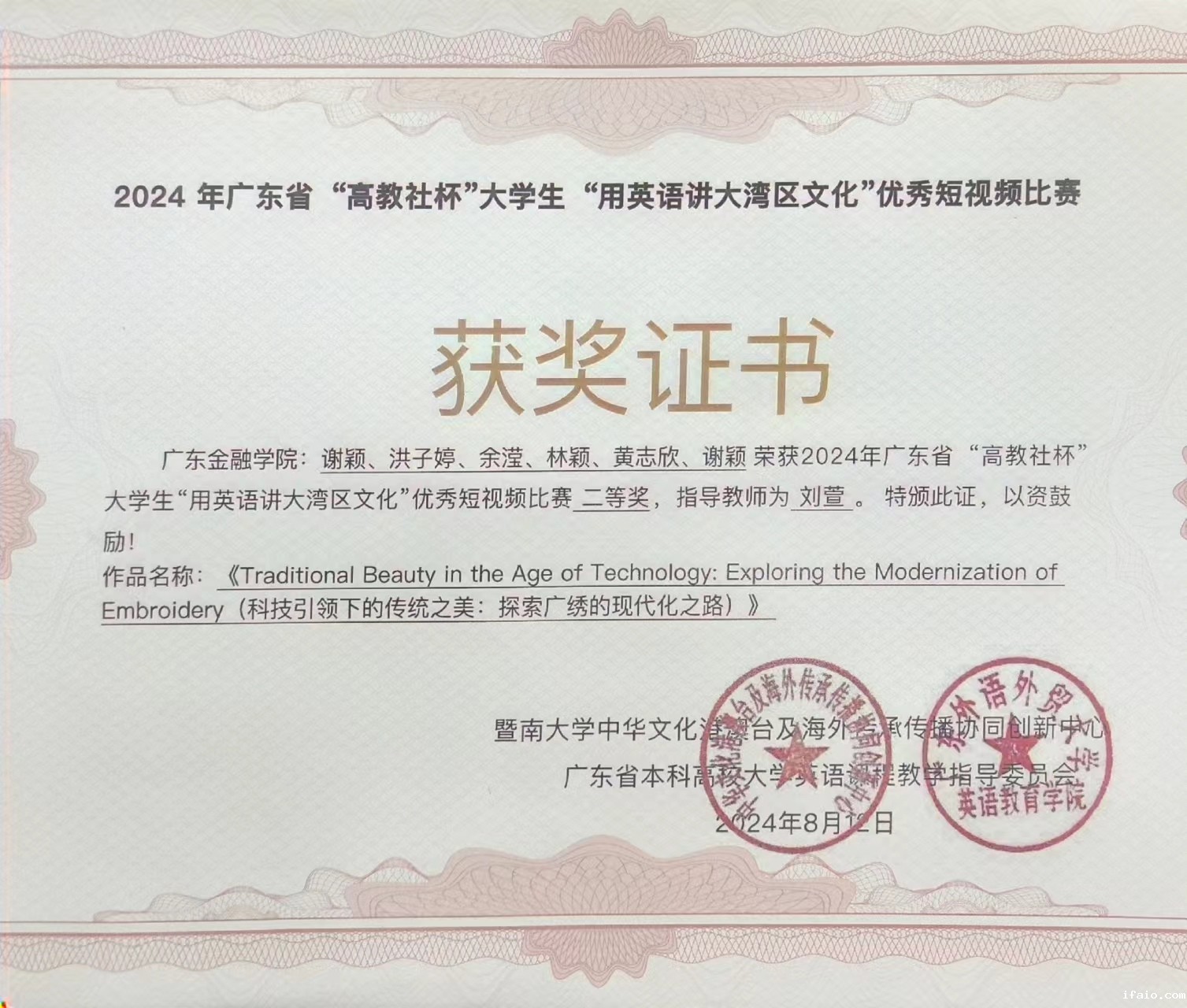 近日,由暨南大学中华文化港澳台及海外传承传播协同创新中心、广东省本科高校大学英语课程教学指导委员会、高等教育出版社联合主办的2024年广东省“高教社杯”大学生“用外语讲大湾区文化”优秀短视频比赛获奖名单公布:我校由谢颖,洪子婷,余滢,林颖,黄志欣组成的团队(指导教师:刘萱)的作品“Traditional Beauty in the Age of Technology: Exploring the Modernization of Embroidery(科技引领下的传统之美:探索广绣的现代化之路)》”荣获省赛二等奖。