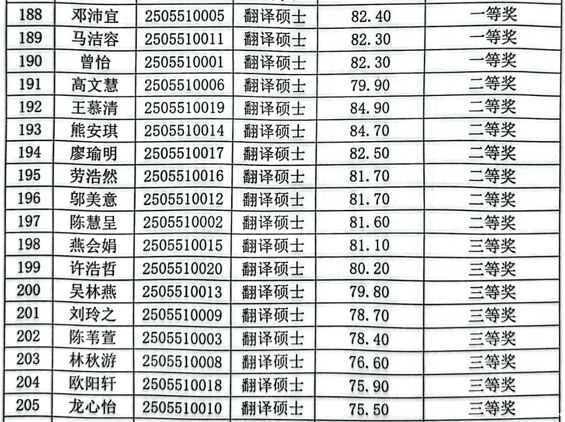 据我校研究生院近日发布的研究生学业奖学金评审结果,我院首批入学的翻译专业硕士全部获得学业奖学金,其中邓沛宜、马洁容、曾怡3人为一等奖,高文慧等7人为二等奖,燕会娟等8人为三等奖。